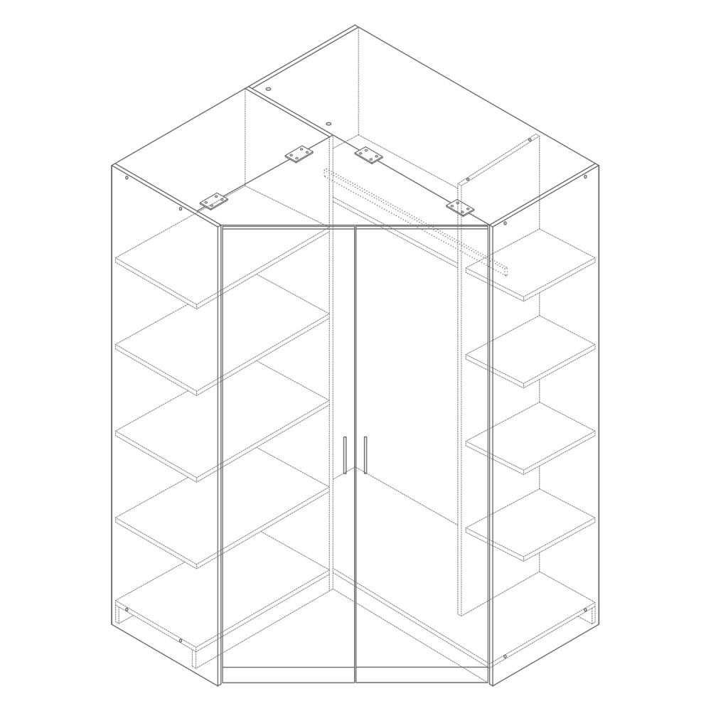 barevné provedení bílá rohová šatní skříň, 9 polic..