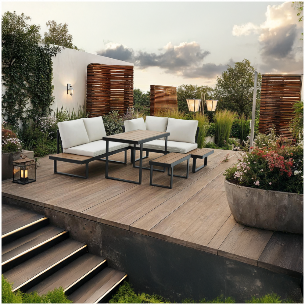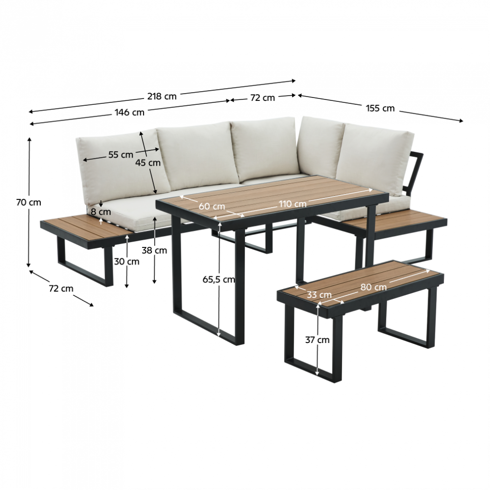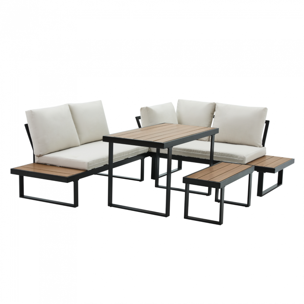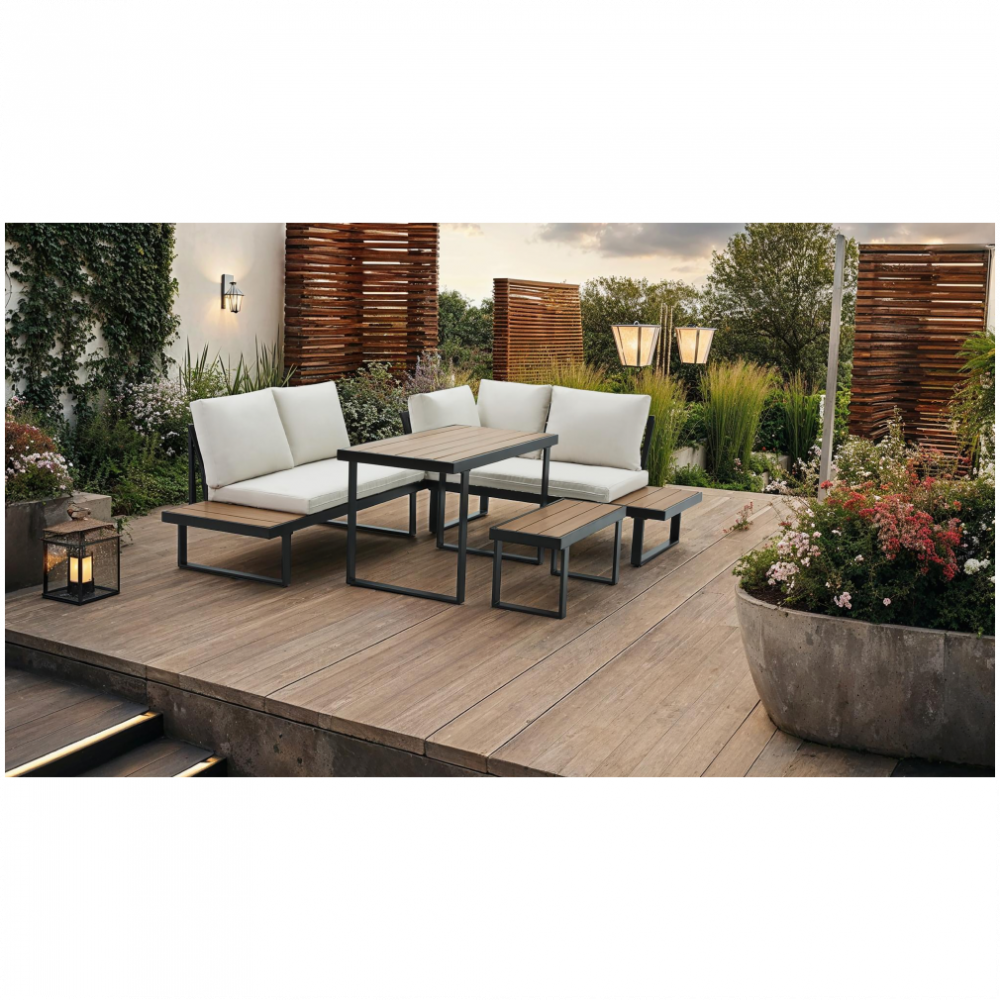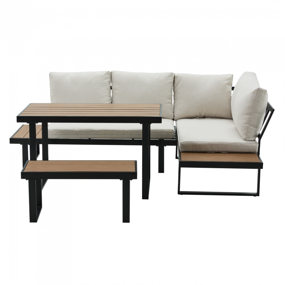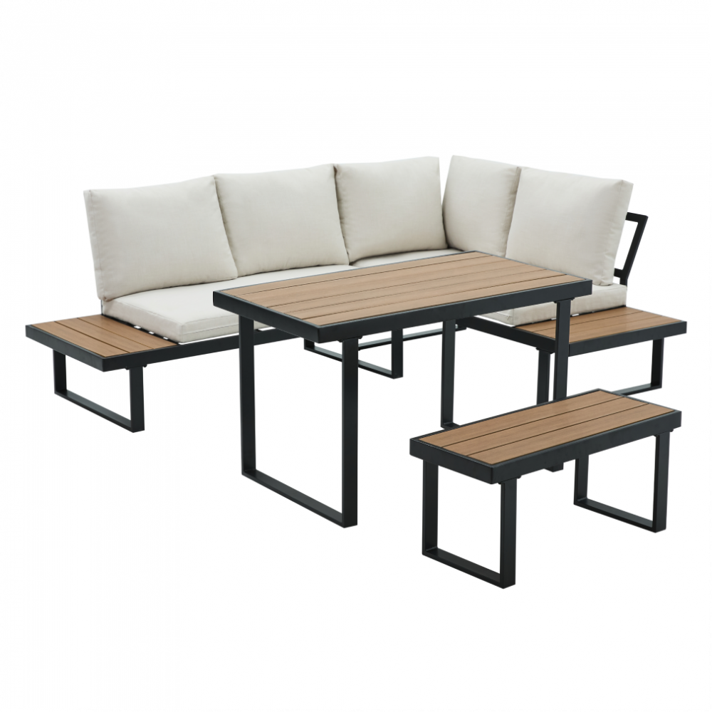 Zahradní set FLOJD černá/krém/dub – rohová modulární sestava s lavicí, stolem a polštáři